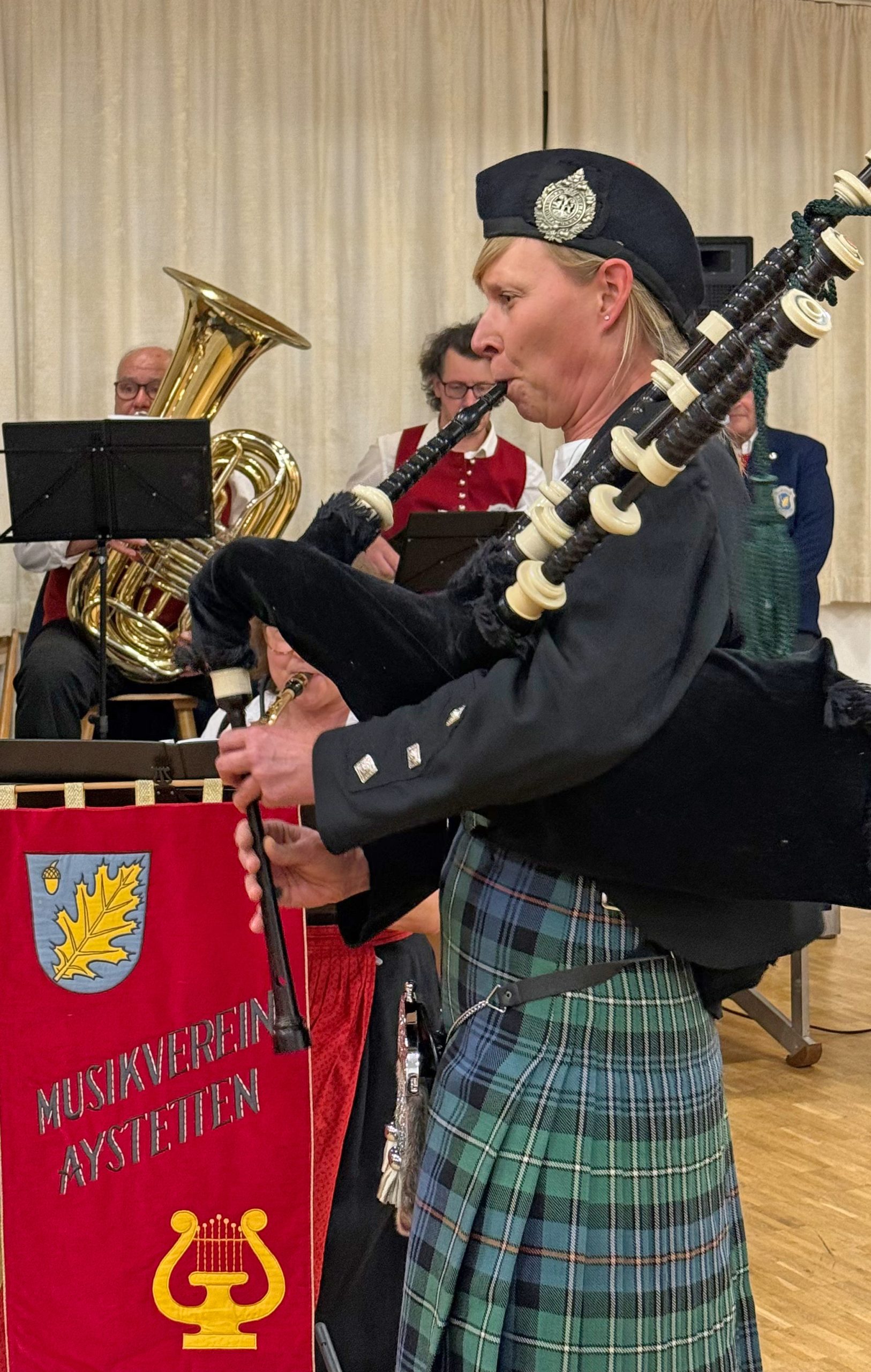 Eine besondere Überraschung hatte Markus Walter, der musikalische Leiter des Musikvereins Aystetten, ans Ende des Herbstkonzerts im Bürgersaal der Gemeinde gesetzt: Nachdem das Blasorchester „Scotland the Brave“ intoniert hatte, trat Britta Stegmeir stilecht im Kilt auf und spielte die inoffizielle Hymne Schottlands auf ihrem Dudelsack, bevor alle zusammen das Stück noch einmal gemeinsam wiederholten und das Publikum zu begeistertem Applaus hinrissen.