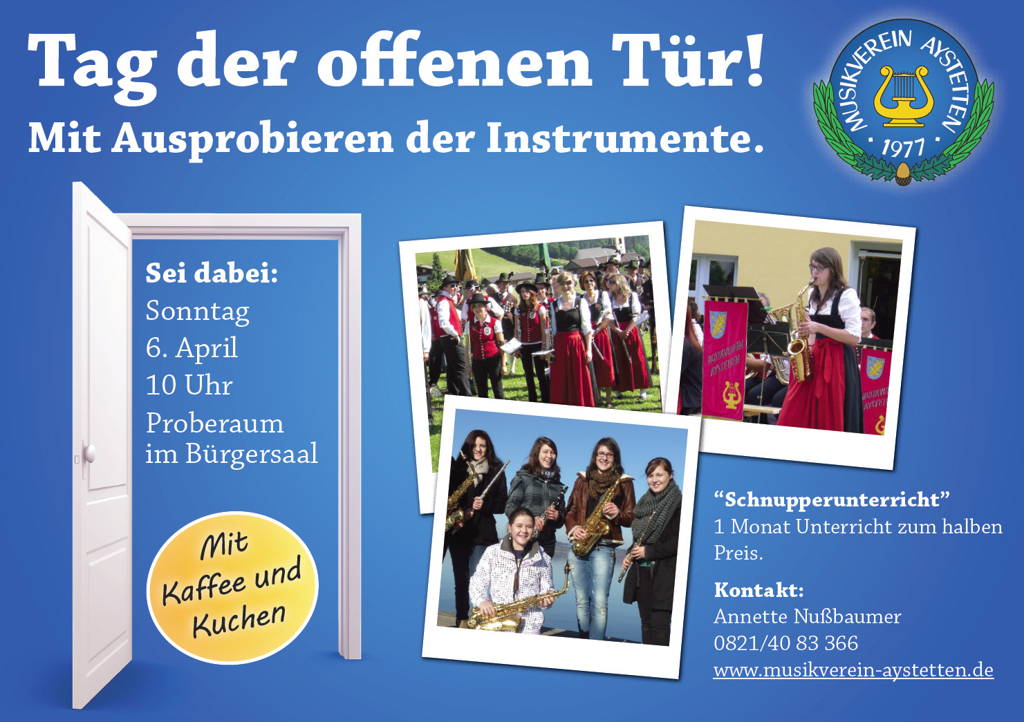 6.April – Tag der offenen Tür Veröffentlicht am 17. März 2014 von Tobias Auch dieses Jahr veranstalten wir wieder einen Tag der offenen Tür. Ihr könnt Instrumente ausprobieren und euch mit uns bei Kaffee und Kuchen unterhalten. Unsere Jugendkapelle freut sich auf ihren nächsten Auftritt!